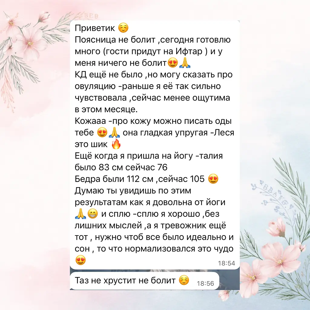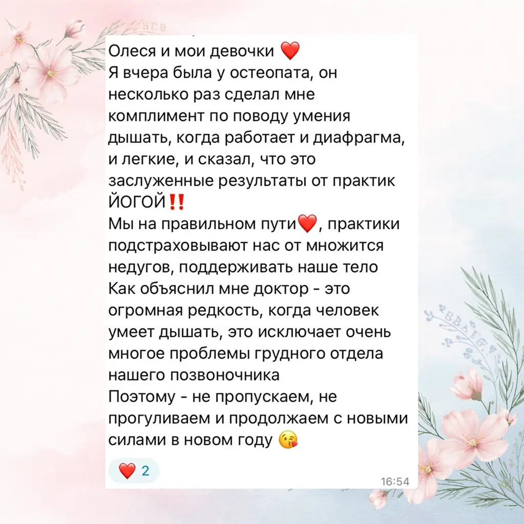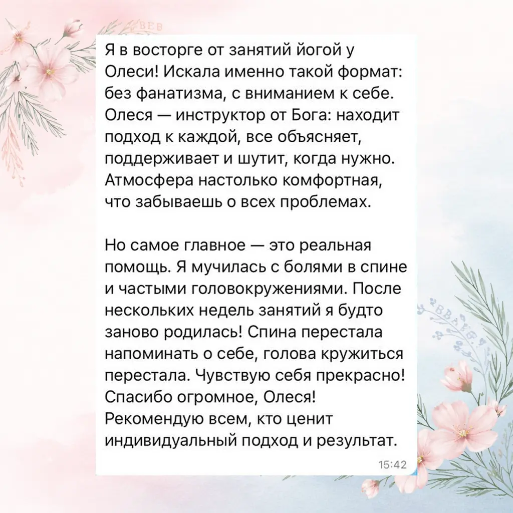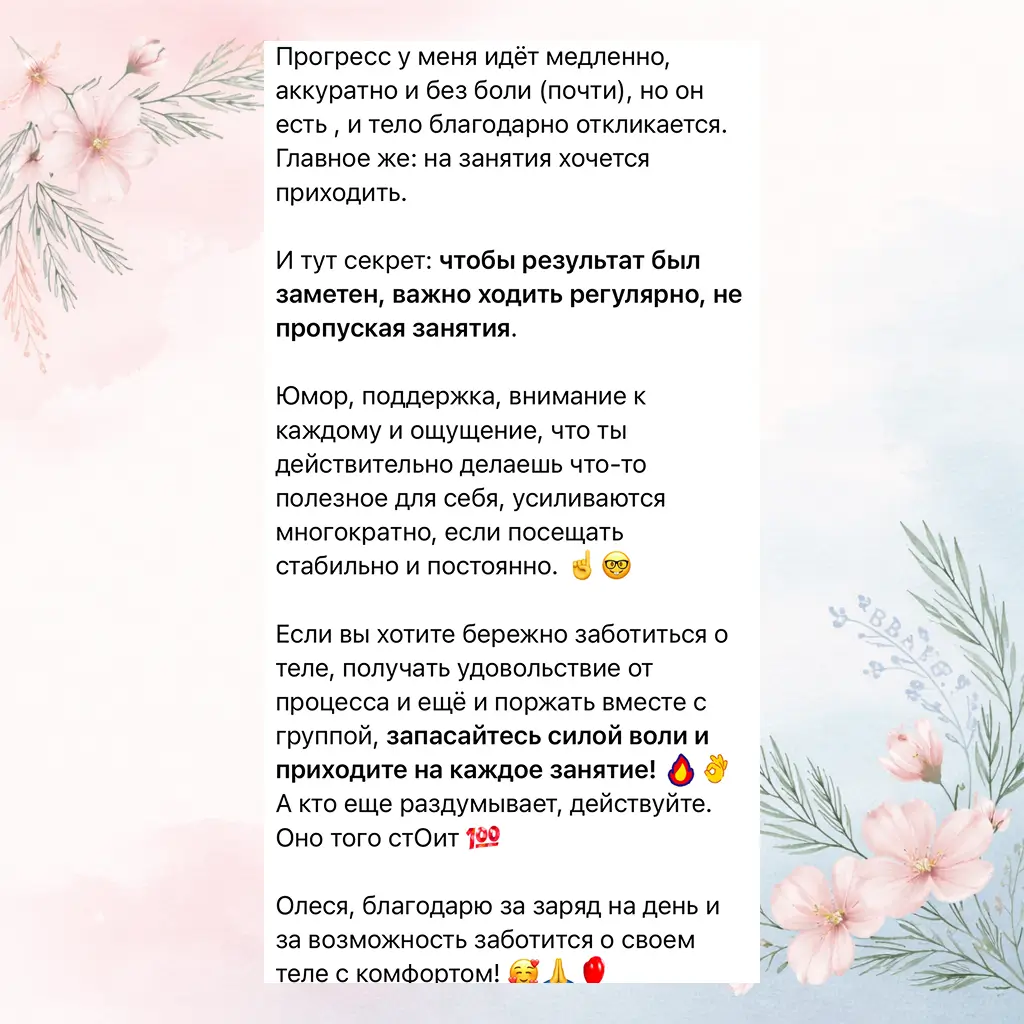 Особое внимание в моих занятиях уделяется здоровью спины, осанке и снятию хронического напряжения. Многие приходят с болями, усталостью, зажимами и страхом навредить себе — и постепенно возвращают доверие к своему телу.