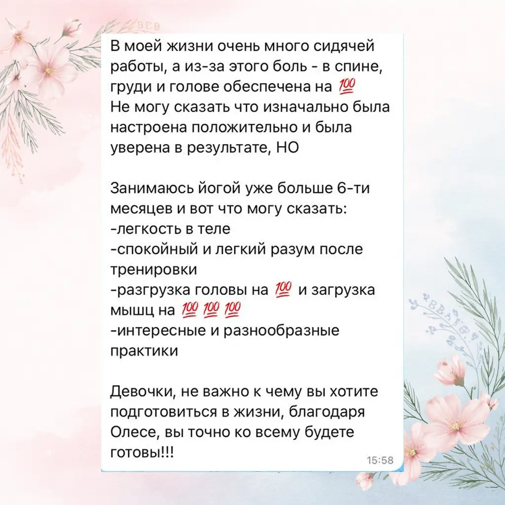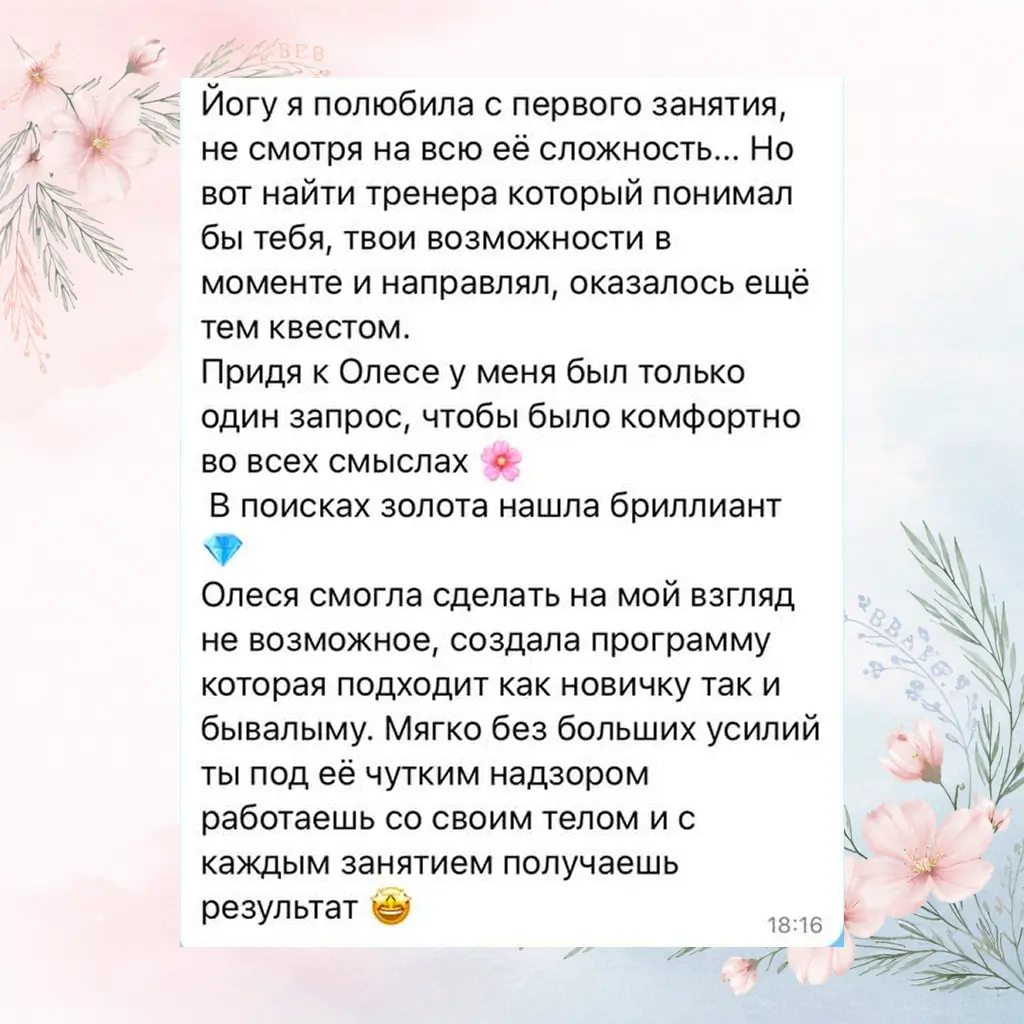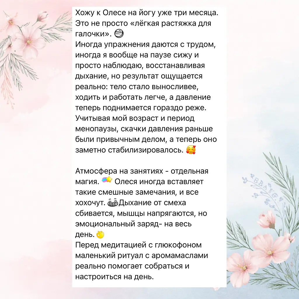 Я работаю с женским здоровьем, спиной, тазовым дном, восстановлением после родов, гормональным фоном и состоянием нервной системы. Для меня йога — это не про сложные позы и «терпеть через усилие». Это про понимание тела, его сигналов и мягкую, осознанную работу с движением и дыханием.